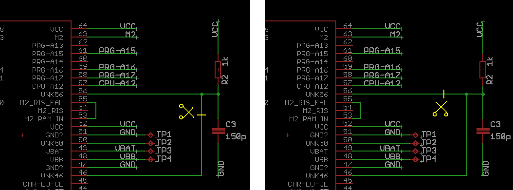 * Test Pad 2 is output pin: driven by 5V when the cartridge is powered from console (VbatteryBackup > Vbattery) is at 0v when the the cartridge is powered only by internal battery (VbatteryBackup < Vbattery). Probably it is a testing pad to check either if memory correctly switches to low-power mode or is it protected against writes when in battery backup mode.