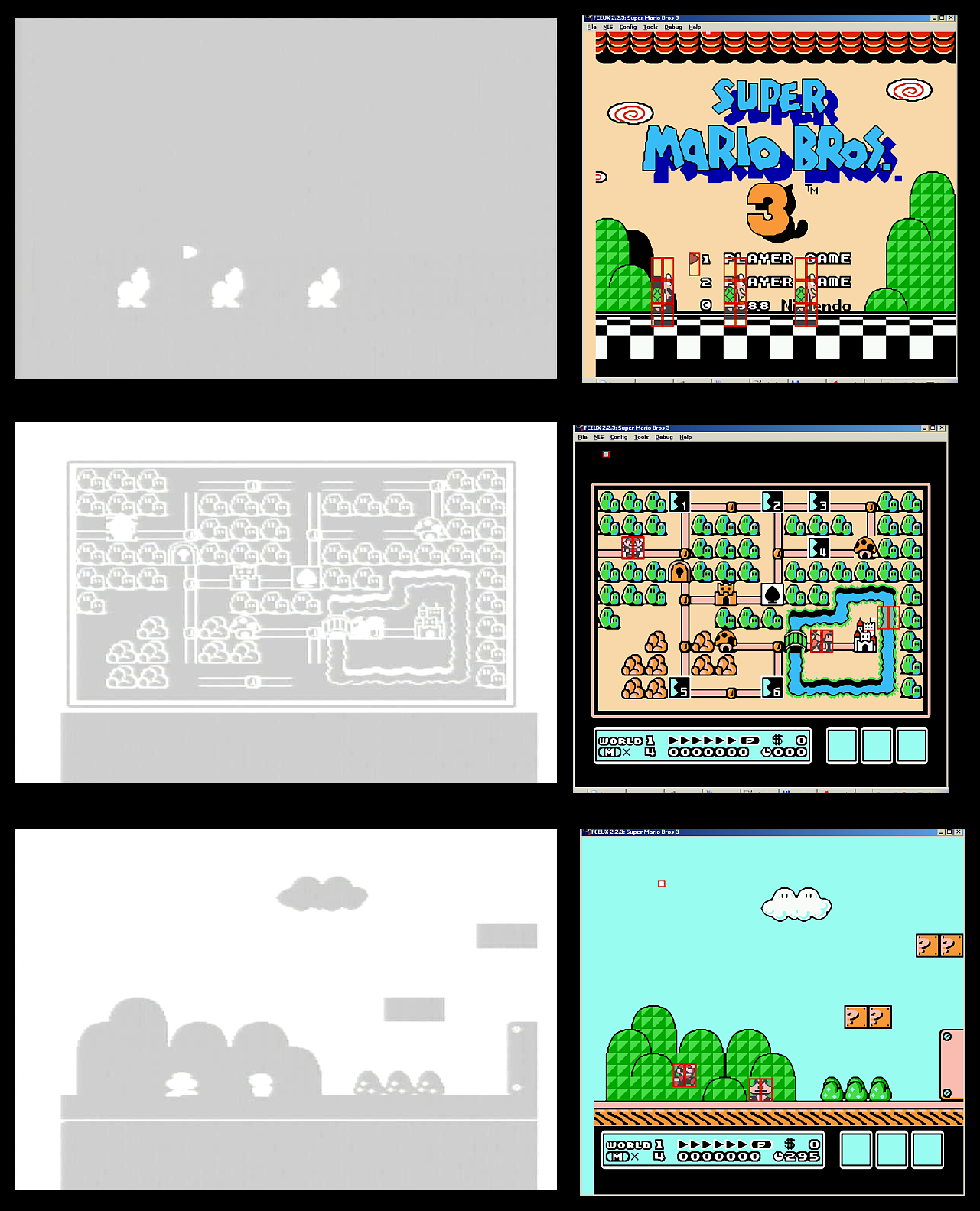 This is preview of what actually generates the PPU (on the left) vs what actually should be on screen added boxes over sprites):